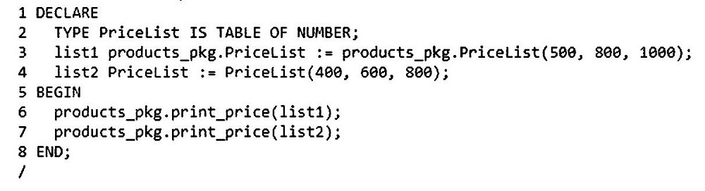 DBMS_OUTPUT.PUT_LINE(p_price(i)); END LOOP; END; END products_pkg; /